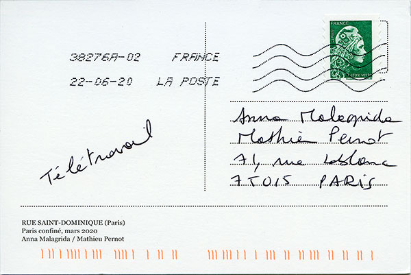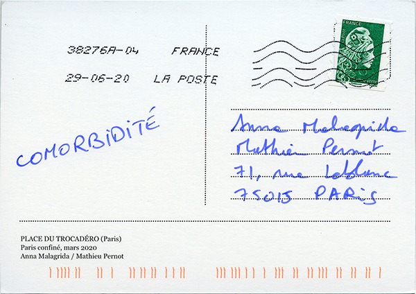 Le 17 mars 2020 commence le confinement de la ville de Paris en raison de l'épidémie de Coronavirus. L'interdiction de se déplacer dans la capitale, ainsi que dans l'ensemble du pays sera prolongée jusqu'au lundi 11 mai. Dans le Paris historique vidé de ses habitants, Anna Malagrida et Mathieu Pernot photographient la ville en adoptant un point de vue de touriste par la création de cartes postales imprimées. Au dos de ces images que les auteurs se sont envoyées par voie postale figure le nouveau vocable apparue durant l'épidémie. Exposées sur un présentoir provenant d'un ancien kiosque à journaux parisien, les images révèlent à fois la nostalgie d'un Paris de Cartes Postales et l'angoisse face la menace invisible de la pandémie.